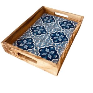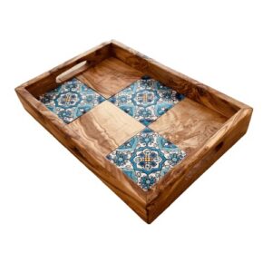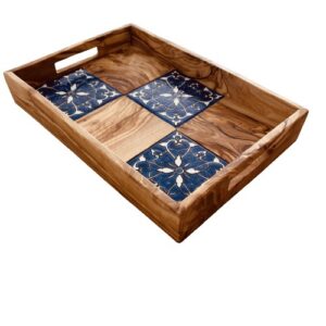 Collection of wooden trays of olive wood with handmaiden and hand painted ceramics with natural colors